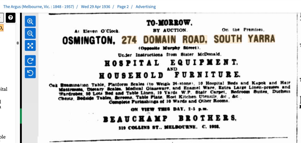 About the time Charlie and Doss list their home address as 274 Domain Road it is part Nurse’s Quarters, part Crippled Childrens’ Hospital (taking overflow from the Carlton Crippled Childrens’ Home), part boarding house, part business and Lawyers’ Offices, part Returned Services Offices, Doctors’ Residences and anything else capable of moving at short notice.