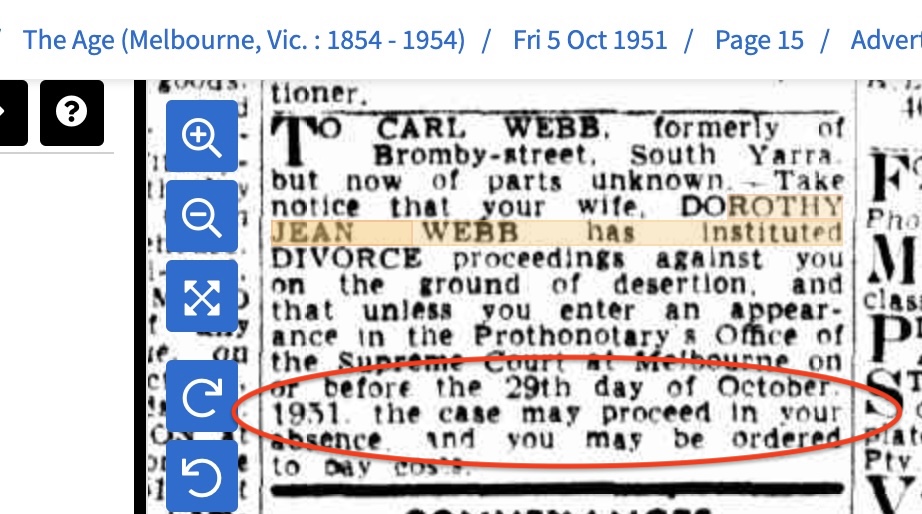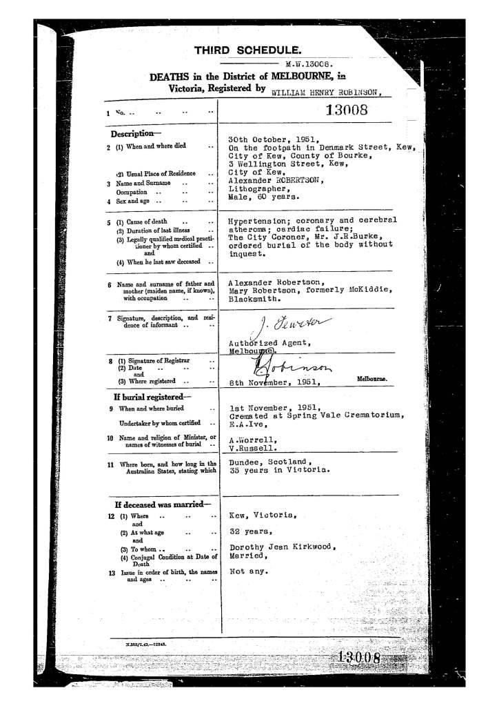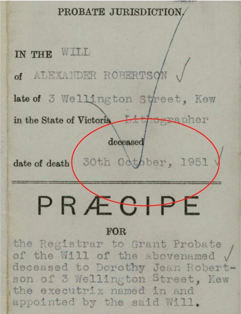 Is it coincidence that Dorothy Jean Webb listed the “notify before” date of 29th October 1951, as the next day Alexander Robertson (supposed husband of Dorothy Jean Kirkwood Robertson) dies in Kew?