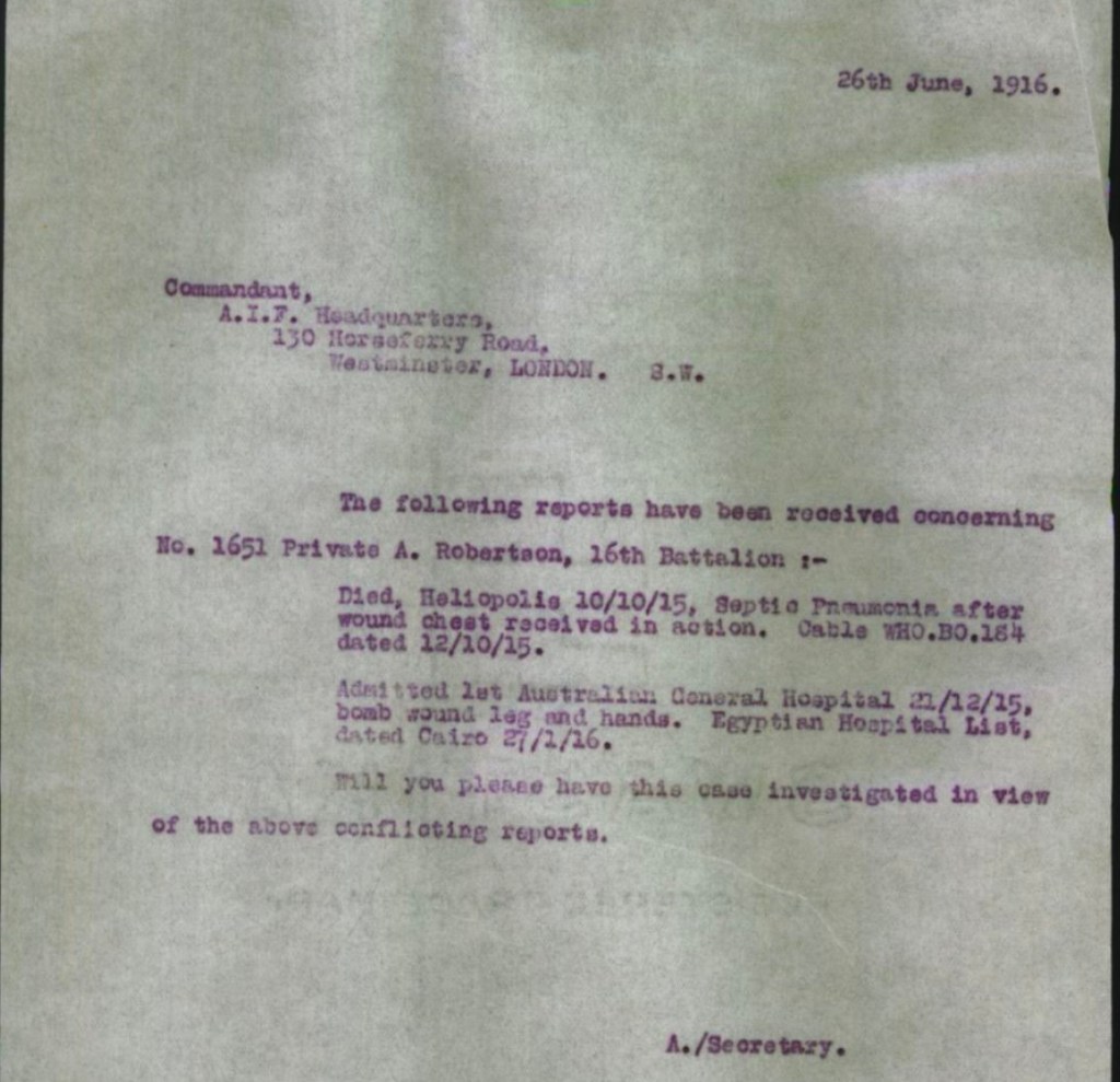 Did Alexander Robertson die on 10th October 1915 in a Military Hospital in Cairo from wounds received in “Leane’s Trench”?